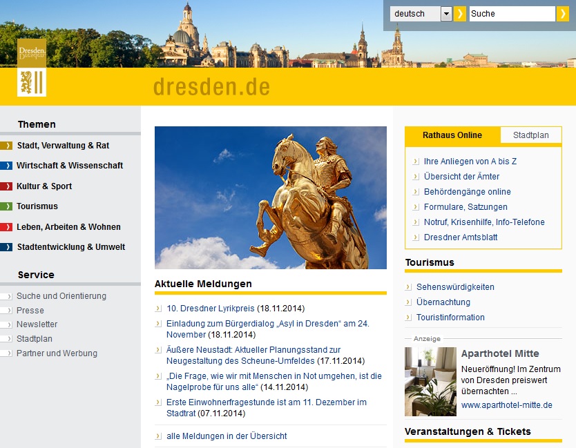 Dresden ist wieder im Netz. Nach einem über 48-stündigen Ausfall der Internetseite dresden.de ist am Mittwochvormittag der Internetauftritt der Stadtverwaltung wieder in Betrieb gegangen. Im Zuge der Rathaussanierung zieht derzeit das Rechenzentrum der Stadt vom Erdgeschoss ins Obergeschoss. Dabei war ein zentraler Datenspeicher am Sontagabend ausgefallen. Über 30.000 Seiten mussten wieder eingespielt werden, teilte die Verwaltung mit.