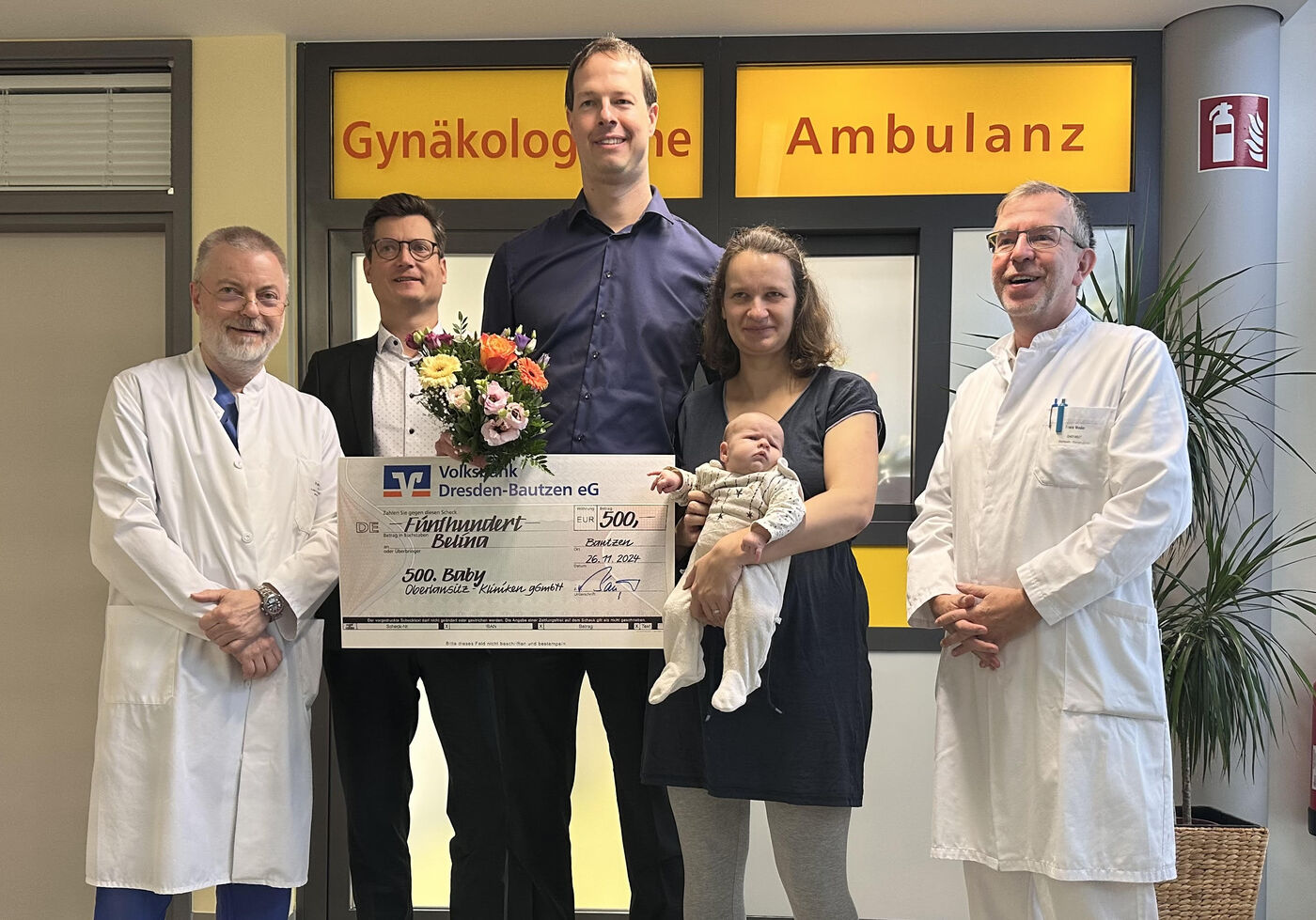 - v.l.n.r.: Oberarzt Frauenklinik Bautzen Dr. Reimar Andretzky, Andreas Baumgärtel von der Volksbank Dresden-Bautzen, Vater Manuel Kuzaj, Mutter Theresa Kutaj mit Tochter Belina, Ärztlicher Direktor der Klinik Dr. med. Frank Weder.