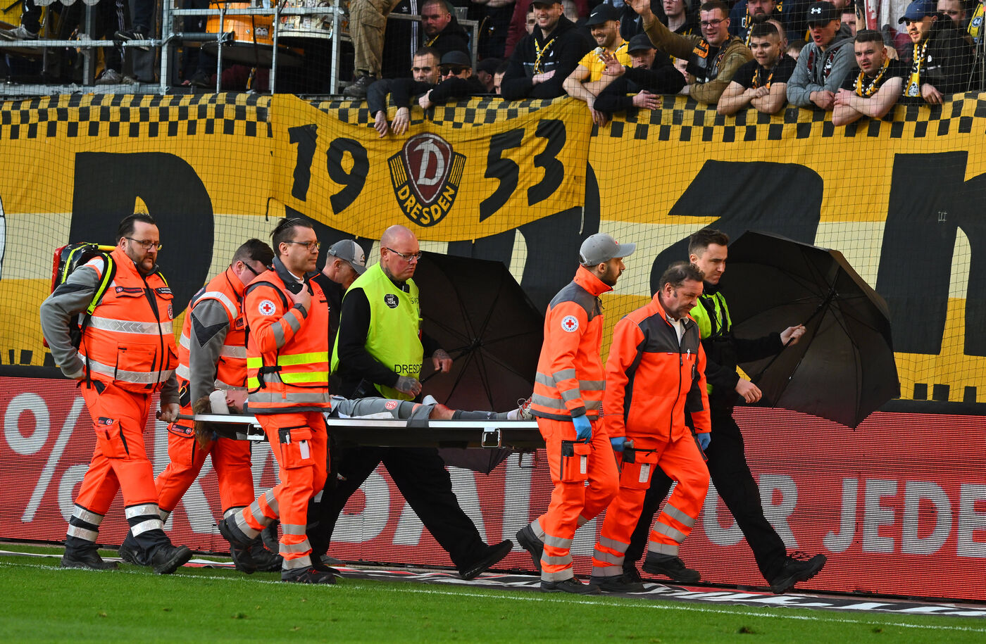 Der 26-Jährige war am Samstag mit einer blutenden Platzwunde auf einer Trage vom Platz gebracht worden. Daraufhin war er mit „Auf-Wiedersehen-Rufen“ aus dem Dynamo-Fanblock verabschiedet worden. Auch mussten ihn die Sanitäter mit Regenschirmen vor Wurfgeschossen aus der Kurve schützen.