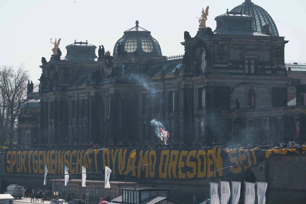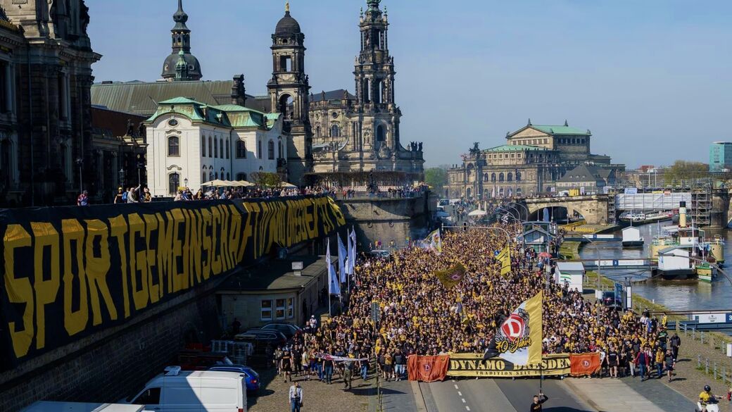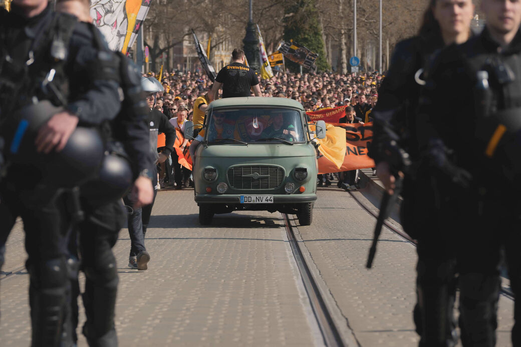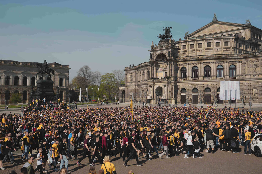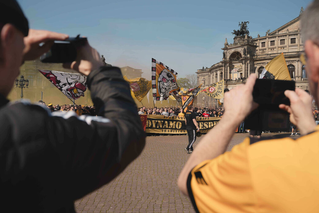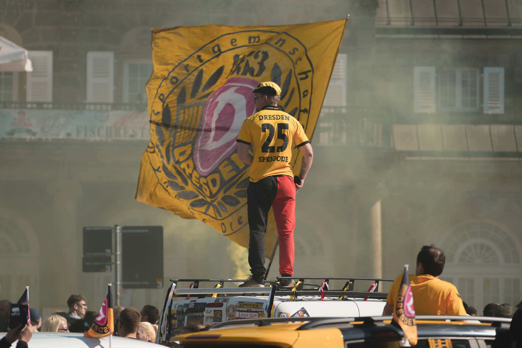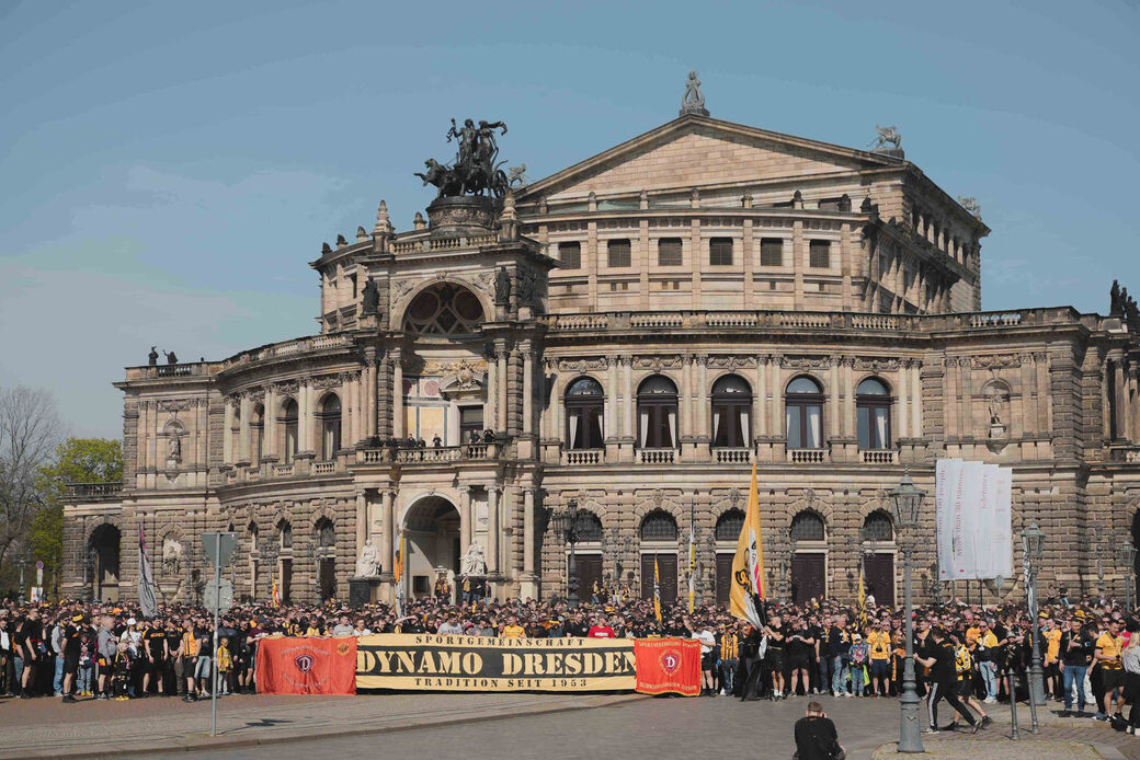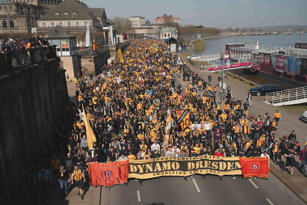 Bereits im Vorfeld der Partie hatten die Anhänger der SGD mit einem riesigen Fanmarsch den Spieltag gestartet. Mehrere tausend Teilnehmer zogen am Vormittag durch die Innenstadt zum Rudolf-Harbig-Stadion. Dabei wurde Pyrotechnik und Böller gezündet. Auf der Brühlschen Terrasse wurde ein etwa 100 Meter langes Banner ausgerollt. Vor der Semperoper legte der Fanmarsch einen Fotostopp ein. Die Polizei begleitete die Route der Dynamo-Fans und sperrte den Weg weiträumig ab.