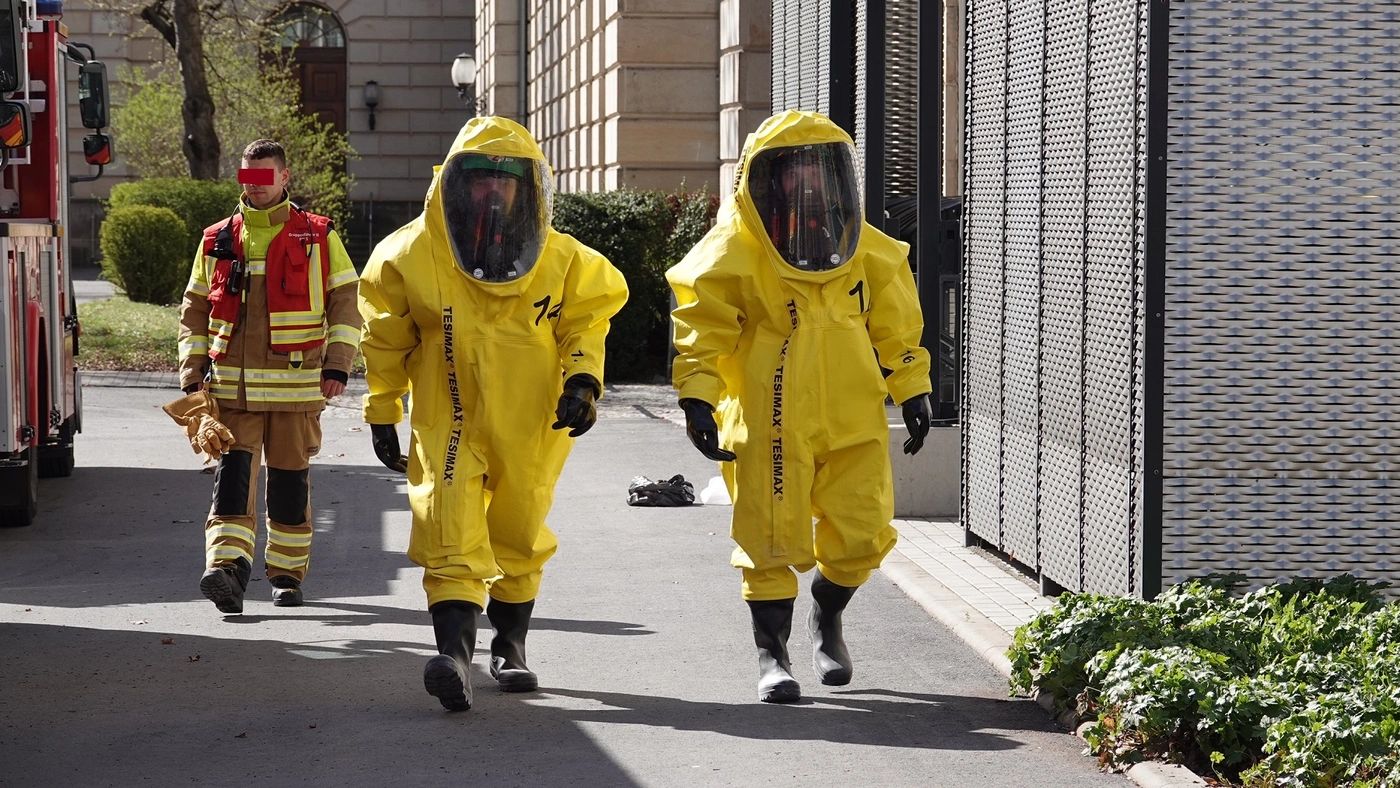 Die Feuerwehr richtete vor dem Gebäude einen Dekontaminationsplatz ein. Dort wurden Einsatzkräfte, die im Gefahrenbereich tätig waren, nach Verlassen des Bereichs gereinigt. Ziel dieser Dekontamination ist es, anhaftende Gefahrstoffe von Schutzkleidung und Ausrüstung zu entfernen, um eine Verschleppung von Schadstoffen zu verhindern und die Sicherheit der Einsatzkräfte sicherzustellen.
