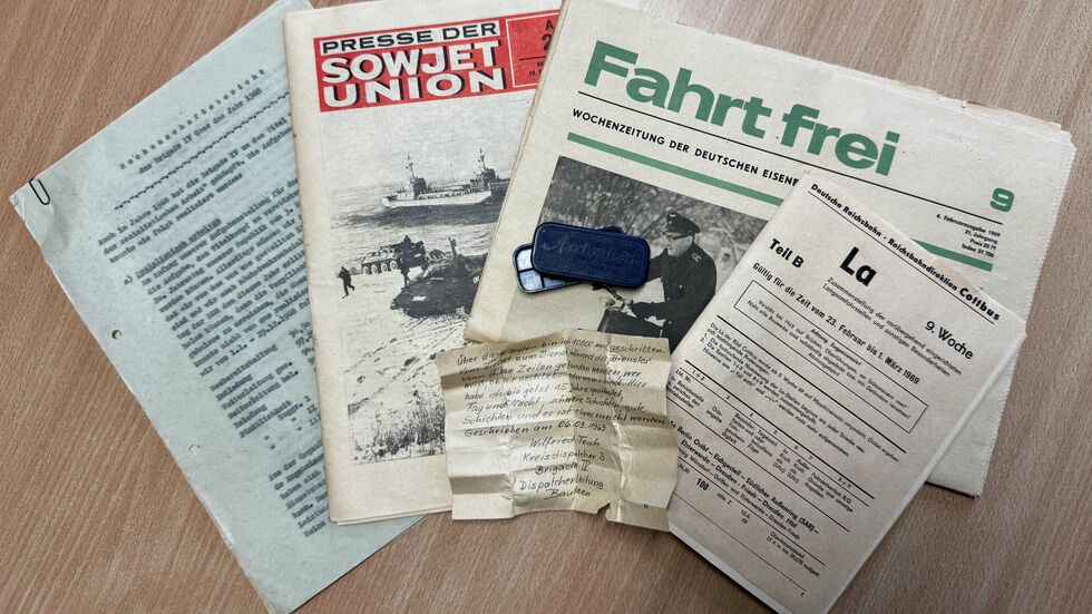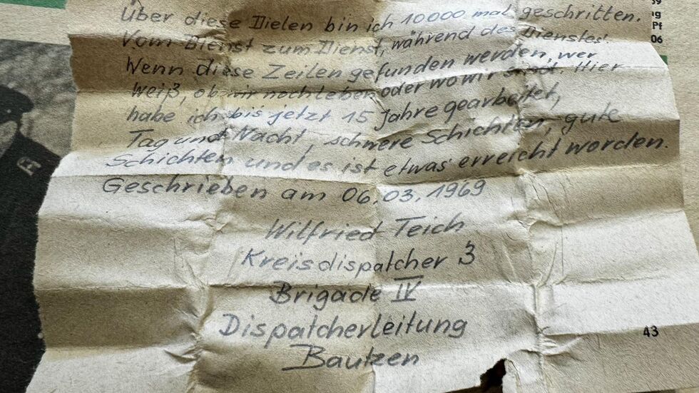 In einer Bäckertüte steckten Dokumente aus der damaligen Zeit: Ein Fahrstellenheft, eine Ausgabe der Eisenbahnerzeitschrift „Fahrt frei“, eine sowjetische Zeitung und der Rechenschaftsbericht der Brigade IV. Zum Eisenbahnerkollektiv gehörte Wilfried Teich. Er hinterließ in einer Tablettenschachtel – der zweiten Zeitkapsel – eine Nachricht an die Nachwelt. „Über diese Dielen bin ich 10.000 mal geschritten. Von Dienst zu Dienst. Hier habe ich bislang 15 Jahre gearbeitet. Tag und Nacht. Gute Schichten, schwere Schichten“, schreibt der Dispatcher der Brigade IV.