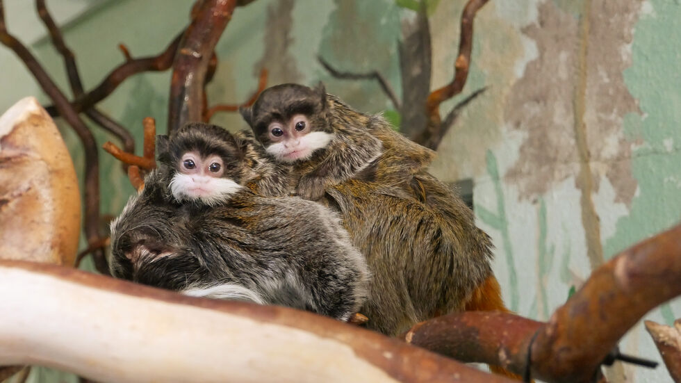 Nachwuchs im Zoo Hoyerswerda. Es schnurrt bei den Kaiserschnurrbarttamarinen. Zwillinge wurden geboren. Damit ist die Gruppe auf zehn Tiere angewachsen. Die meiste Zeit verbringen die etwa zehn Zentimeter großen Jungtiere auf dem Rücken des Vaters oder der Geschwister. Die Mutter übernimmt den Nachwuchs lediglich zum Säugen. Erst nach rund sieben Wochen beginnen sie, ihre Umgebung eigenständig zu erkunden.