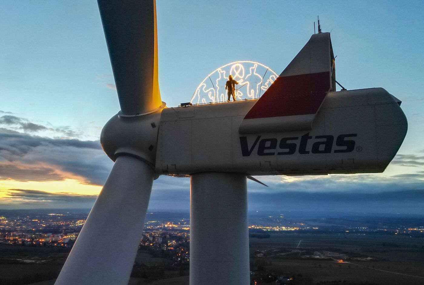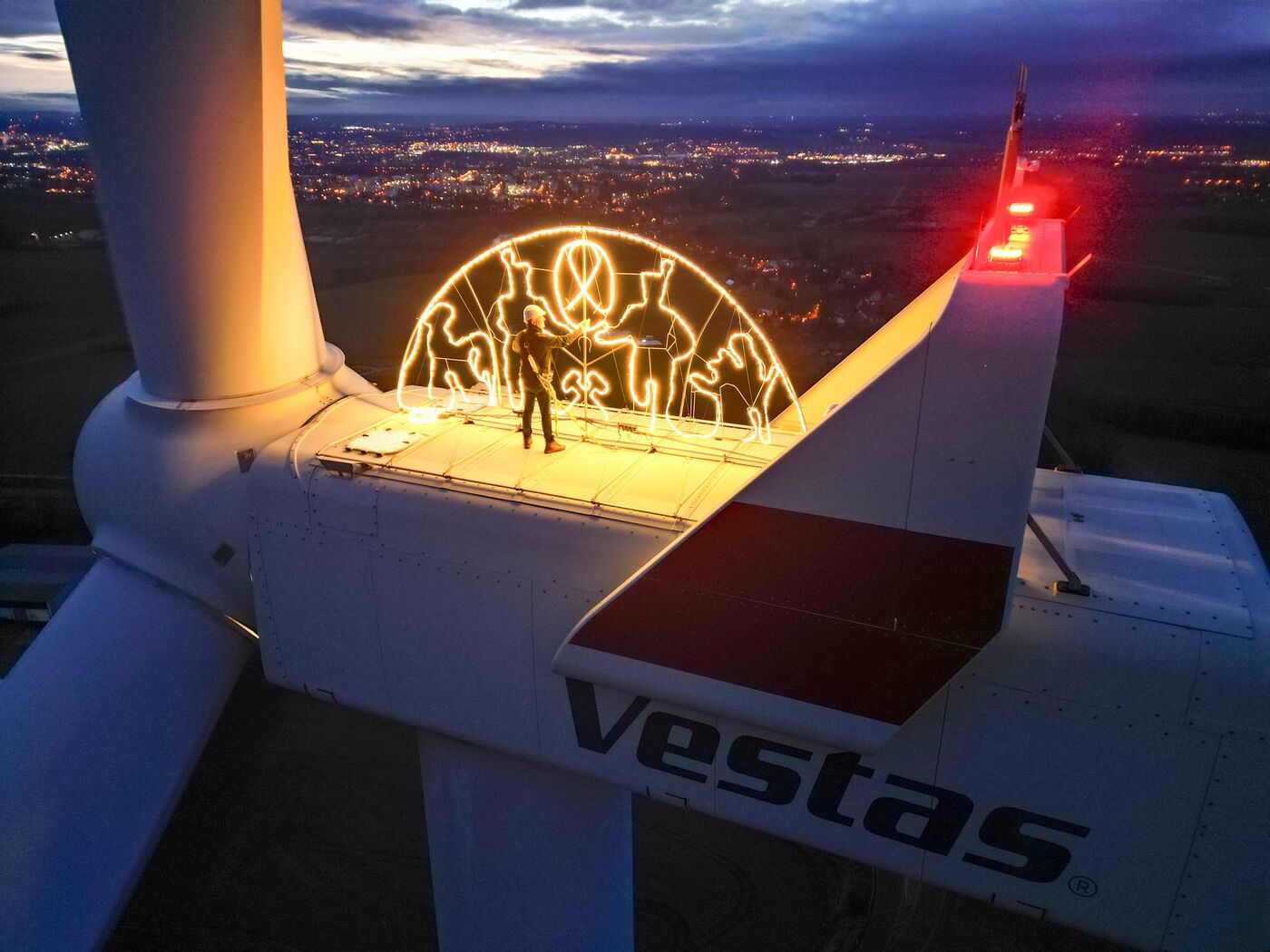 Hoch, höher, am höchsten: Schwibbogen leuchtet auf Windrad