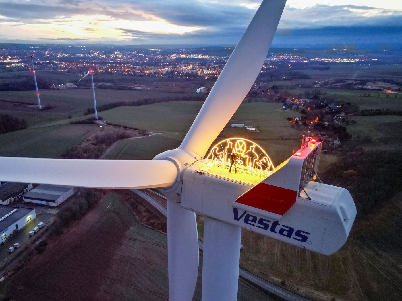- Der sechs Meter große Lichterbogen mit dem Schwarzenberger Motiv leuchtet in 140 Metern Höhe auf dem Maschinenhaus der Windkraftanlage.
