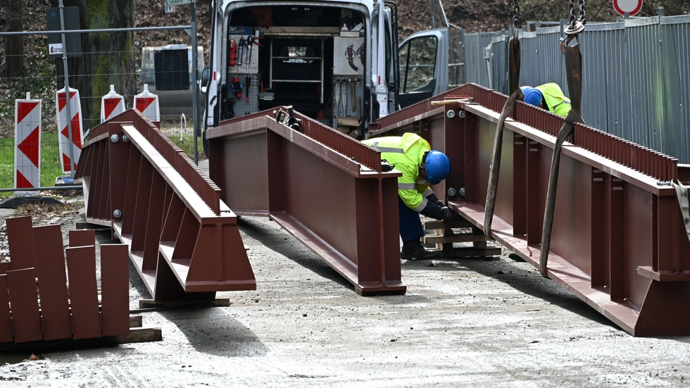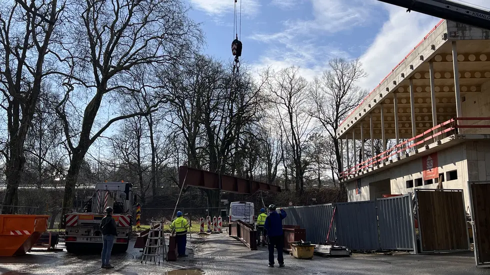 An der Görlitzer Stadthalle sind heute drei 20 Meter lange Stahlträger für das neue Orgeldach eingesetzt worden. Die Bauteile gehören zur Stahlbeton-Konstruktion, die das bisherige Holzgebälk ersetzt.