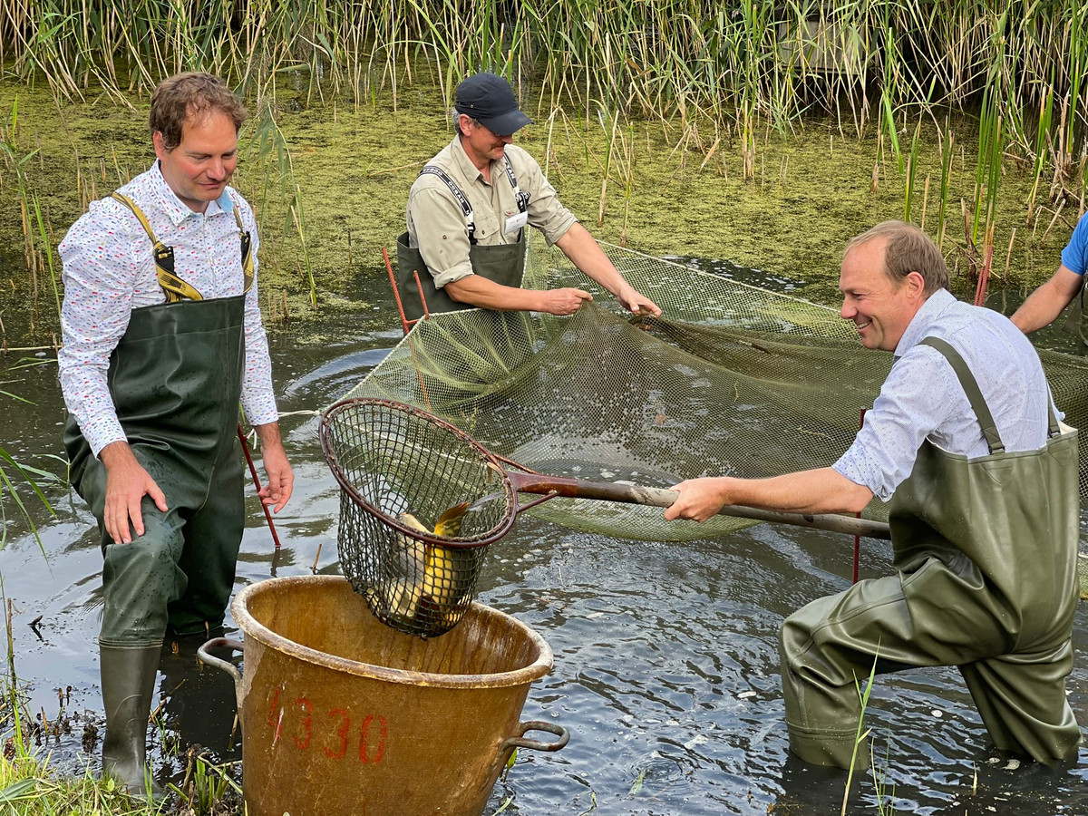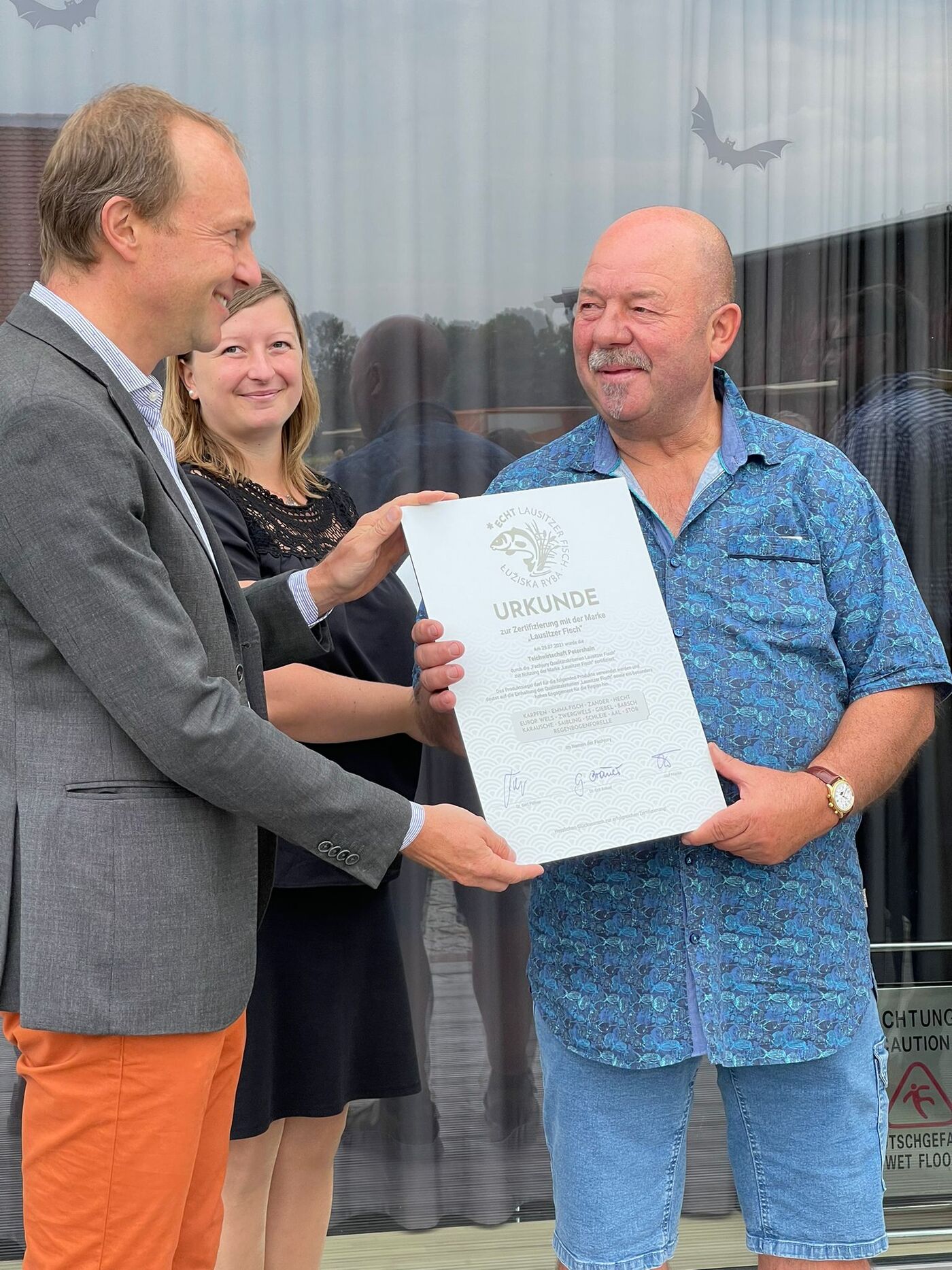 - Agrarminister Wolfram Günther überreicht die Zertifizierungsurkunde an Teichwirt Armin Kittner.