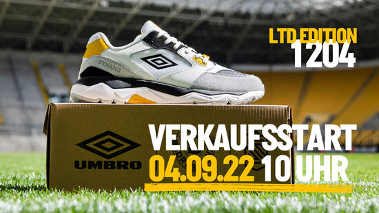 Dynamo-Fans können ihre schwarz-gelbe Liebe künftig auch am Fuß zeigen. Am Sonntag (4.9.) 10:00 Uhr ist Verkaufsstart für den Dynamo-Sneaker. Den „Umbro Stadium Runner“ im Dynamo-Design gibt es in einer limitierten Auflage von 1204 Stück. Die Zahl ist laut SGD eine Hommage an den Vereinsgeburtstag am 12. April. Weitere Info zum Schuh-Highlight der Dynamo-Geschichte will der Verein in nächsten Tagen bekanntgeben.