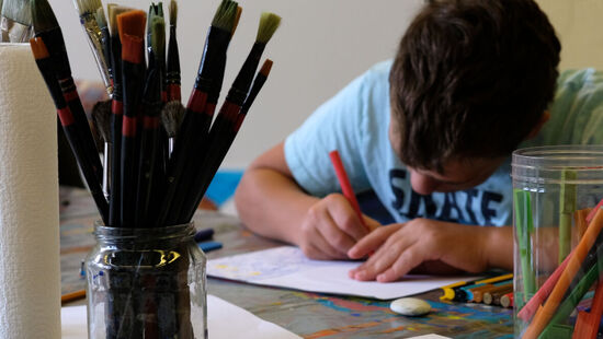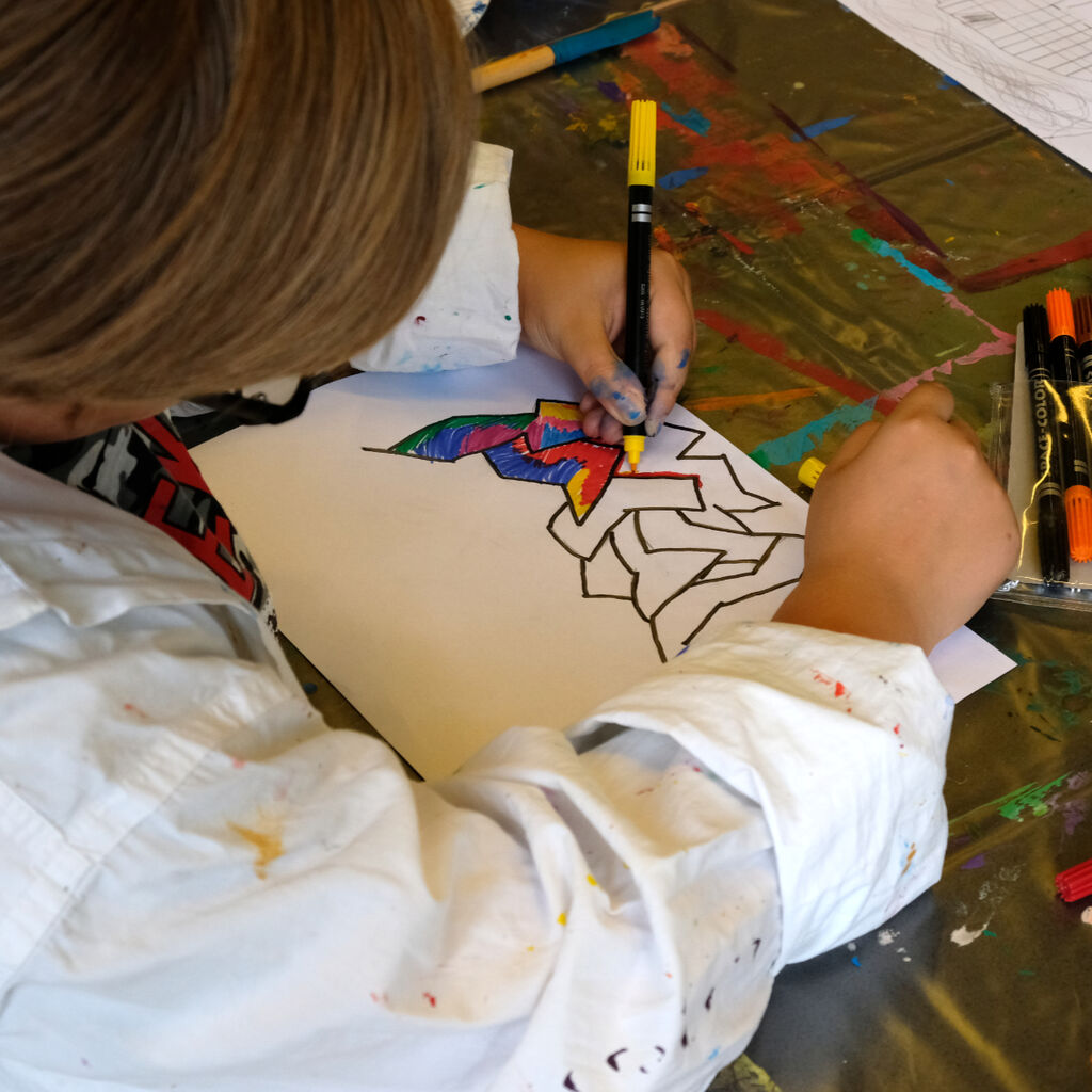 "Man kann hier einfach malen, was einem in den Sinn kommt", schwärmt Lion von dem Ferienangebot. Während ihn die Titanic fesselt, hat zum Beispiel der 13-jährige Jonas sein Gehirn auf der Leinwand festgehalten. Ein Star-Wars-Gefährt ist darin ebenso zu finden wie das Auge aus seinem Lieblingsfilm, aber auch eine Tür mit der Aufschrift "Nicht öffnen!" Maria aus dem Integrativen Familienwohnen dagegen hat ein abstraktes Bild geschaffen. "Ich schaue einfach, was auf der Leinwand entsteht, und lass mich von meinem Bild überraschen", sagt sie.