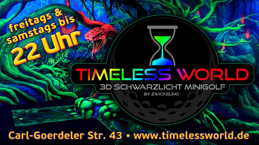 Die Timeless World ist eine 3D Schwarzlicht Minigolfanlage. Mit viel Liebe zum Detail haben die Macher des Zwickauer Indoorspielplatzes Zwickelino ein Erlebnis geschaffen, dass dazu einlädt, einfach mal die Zeit zu vergessen. Taucht ein in eine Welt aus Farben, Formen und Bildern, in der allein deine Phantasie der Regisseur ist.