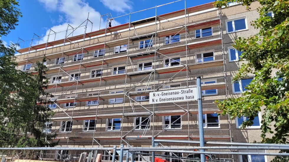 Neues Leben für einen 50-Jährigen in Hoyerswerda. Ein Plattenbaublock an der Neidhardt-von-Gneisenau-Straße wird fit gemacht für die nächsten mindestens 50 Jahre. Der Fünfgeschosser am nordöstlichen Stadtrand soll künftig 58 Pflegewohnungen beherbergen. Die Genossenschaft „LebensRäume“ Hoyerswerda investiert nach eigenen Angaben neun Millionen Euro. „Es ist das größte Bauvorhaben seit den vergangenen Jahren“, so Vorstand Axel Fietzek. Gestern war offizieller Start. Ein Kran wurde aufgestellt.