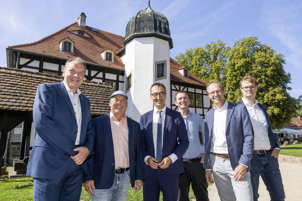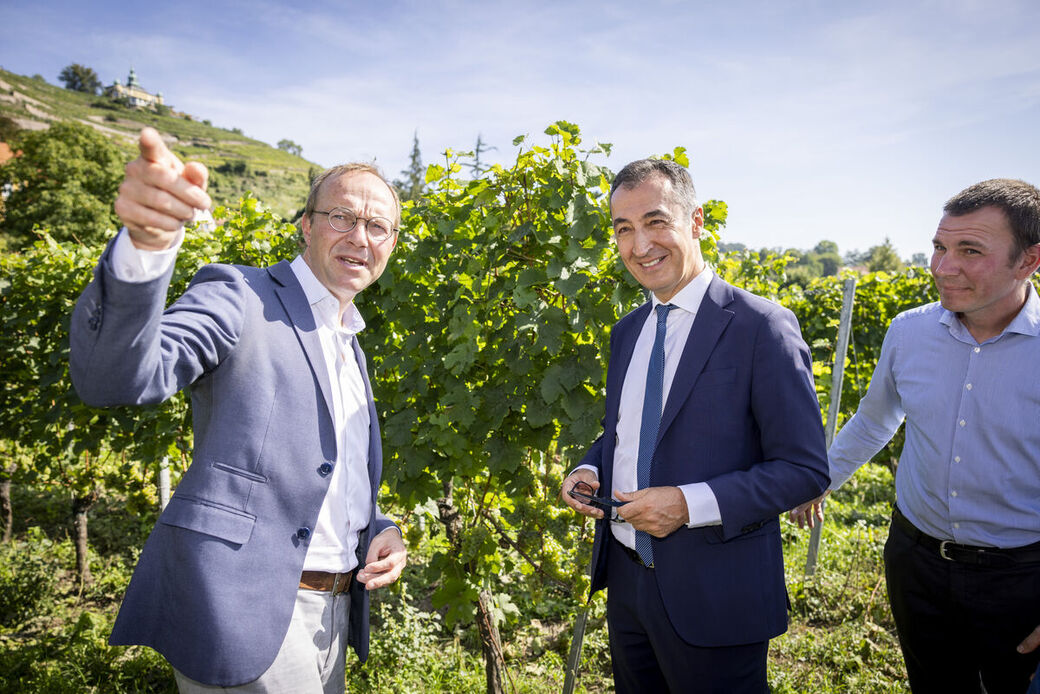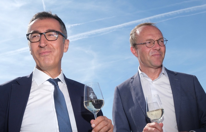 - Cem Özdemir (Grüne/ l), Bundeslandwirtschaftsminister, und Wolfram Günther (Grüne), Landwirtschaftsminister des Landes Sachsen, stehen mit Weingläsern beisammen. Sie besuchten zusammen die Weinberge an der Elbe.