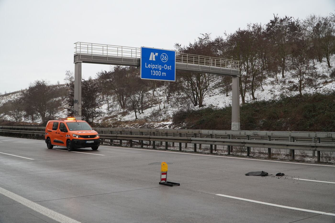 Auf der A14 bei Paunsdorf musste die Leipziger Polizei gestern Abend kurz nach 20 Uhr zur einem ungewöhnlichen Einsatz ausrücken: Mehrere Autos waren durch riesige Schlaglöcher gekracht. „Sie waren bis zu 50 Zentimeter breit und 30 Zentimeter tief“, sagte uns ein Sprecher auf Nachfrage. Insgesamt vier Autos seien durch lose Betonteile beschädigt worden.