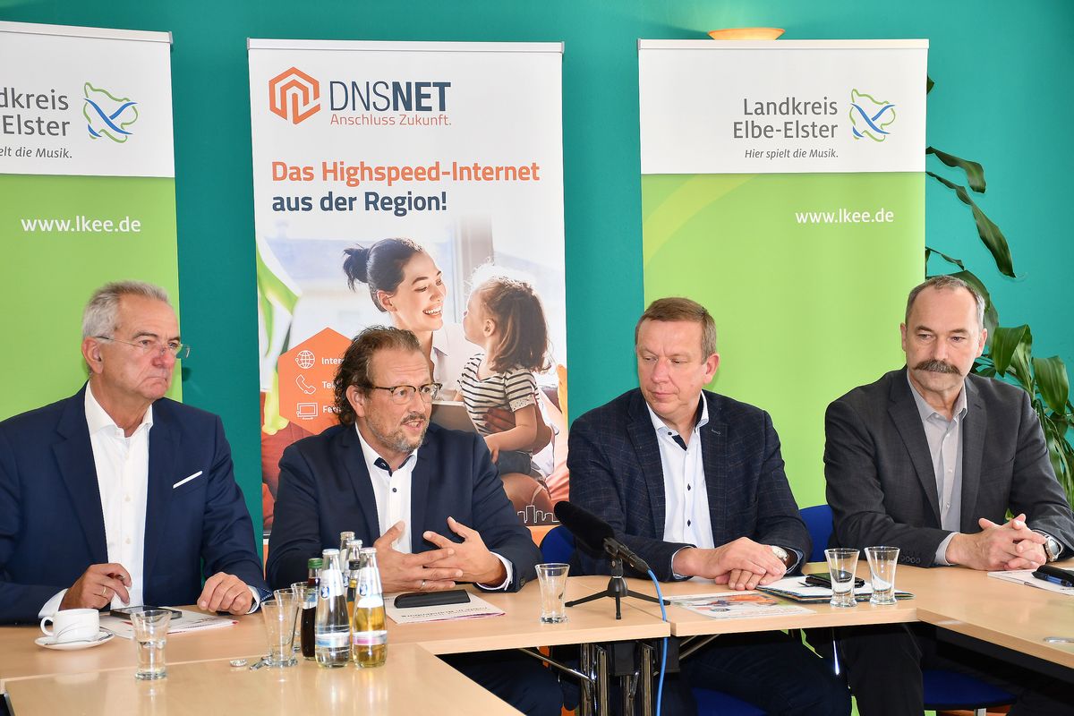 - Hardy Heine, Repräsentant der DNS:NET, Stefan Holighaus, Mitlied der Geschäftsführung DNS:NET, Landrat Christian Heinrich-Jaschinski und Rainer Pilz, Amtsleiter des Amtes für Strukturentwicklung und Kultur des Landkreises Elbe-Elster (v.l.n.r.).