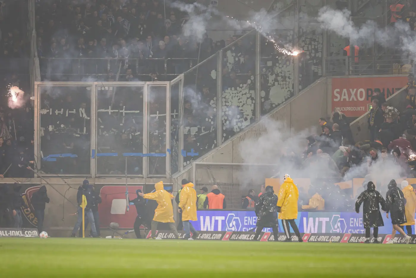 Nach rund 20 Minuten gab die Polizei grünes Licht für eine Fortsetzung. Der gelbgesperrte Dresdner Kapitän Stefan Kutschke versuchte zu vermitteln und zu schlichten. Schon nach drei Minuten hatte Jablonski die Partie erstmals unterbrechen müssen, nachdem beide Fanlager Pyrotechnik abgebrannt hatten.