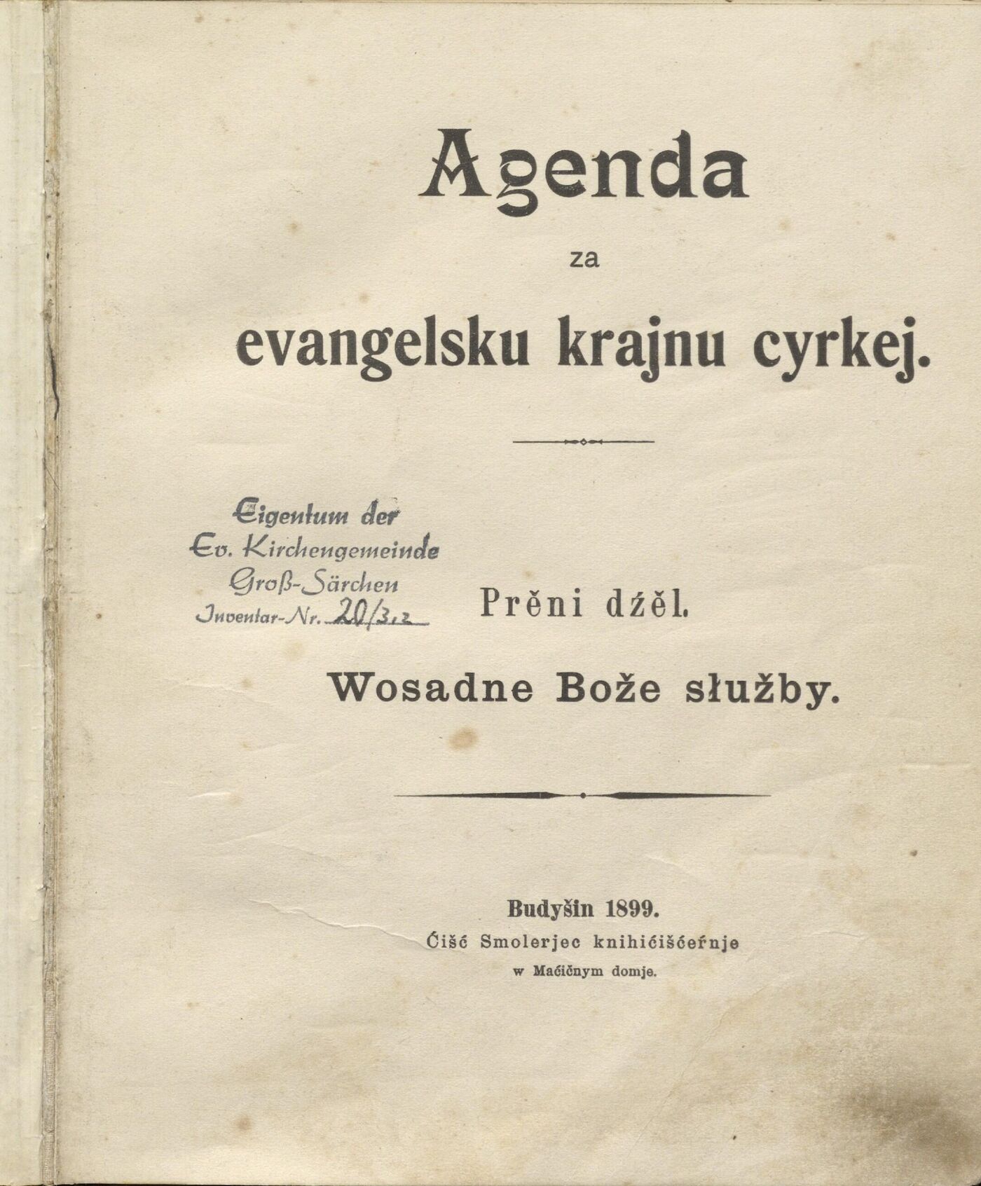 In Groß Särchen ist ein seltenes sorbisches Buch gefunden worden. Es handelt sich um die 1899 in Bautzen gedruckte obersorbische Ausgabe der „Preußischen Kirchen-Agenda“. Die Suche nach dem Band wurde durch die Anfrage eines Sprachwissenschaftlers aus Litauen beim Sorbischen Institut ausgelöst.