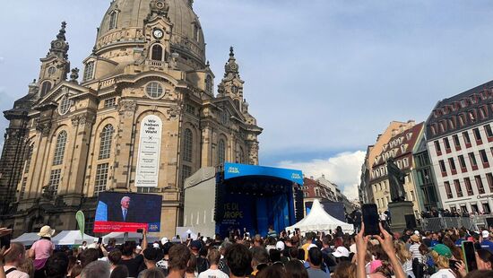 Während Macron sein spätes Mittagessen zu sich nimmt, hätte eigentlich um 15 Uhr die "Fête de l´Europe" auf dem Neumarkt starten sollen. Doch hier kommt es aktuell zu Verzögerungen. Der Platz ist dabei gut gefüllt.