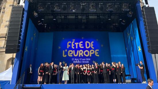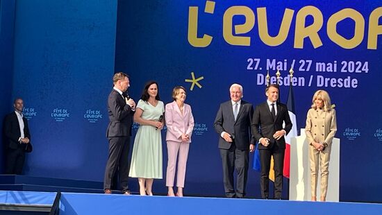 "Alle Farben" hat seinen Auftritt beendet. Nun steht MP Kretschmer bereits auf der Bühne. Von Macron ist noch nichts zu sehen.