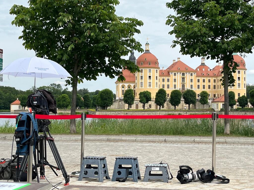 Laut den Informationen unserer Reporterin Claudia Lord, die vor Ort in Moritzburg ist, verspätet sich der Besuch um rund eine halbe Stunde. Ursprünglich sollten die Gäste gegen 13.15 Uhr eintreffen. Derweil bessert sich das Wetter etwas.