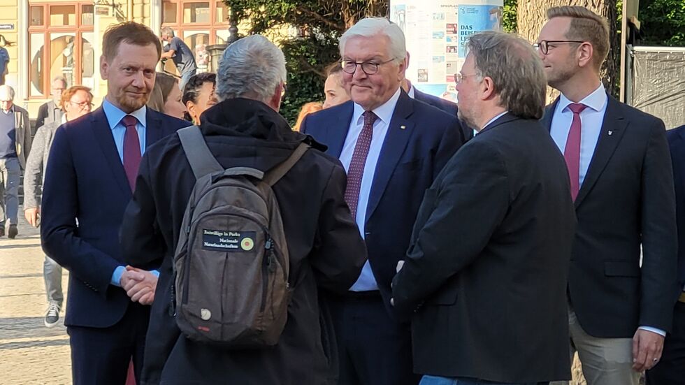 - Kleines Bild unten - Steinmeier kurz vor Vorstellungsbeginn im Gespräch mit Autor Lukas Rietzschel.