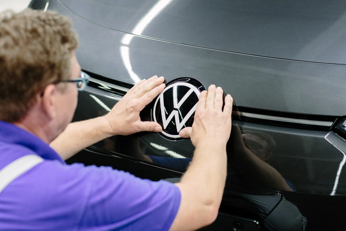 - Ein Mitarbeiter an einem Fahrzeug vom Modell ID.3.
