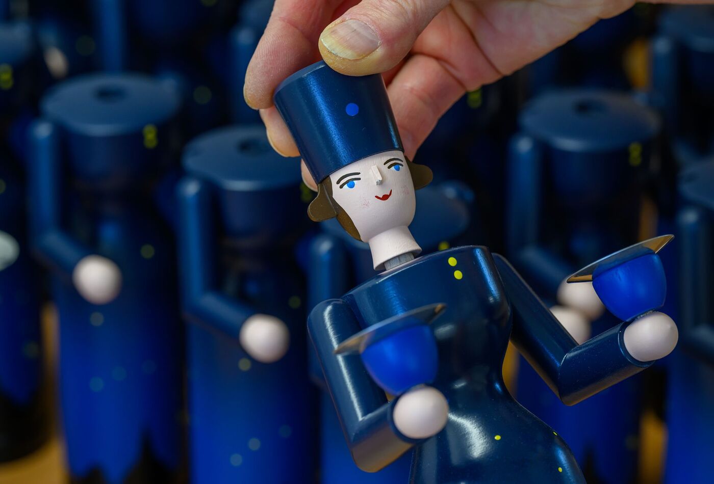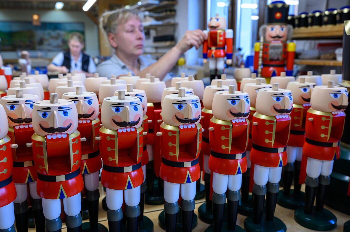 - Nachschub fürs Fest: Fertig produzierte Nussknacker liegen in der Schauwerkstatt der Seiffener Volkskunst eG.