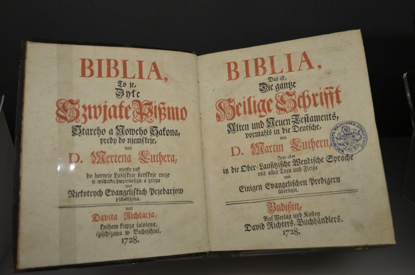 - Die erste Bibel in obersorbischer Sprache von 1728. Dieses Exemplar befindet sich in der Oberlausitzischen Bibliothek der Wissenschaften in Görlitz