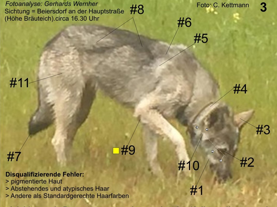 Das Tier auf dem Foto habe lange, kahle Ohren, einen langen Schwanz und eine schwarze Fellfärbung. Das würde für einen Hund sprechen. Dagegen seien der weiße Backenstreifen und die schwarze Routenspitze typische Wolfsmerkmale, so Lebsa