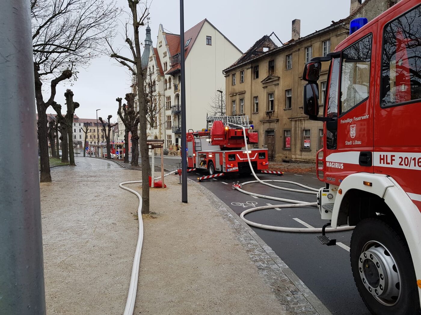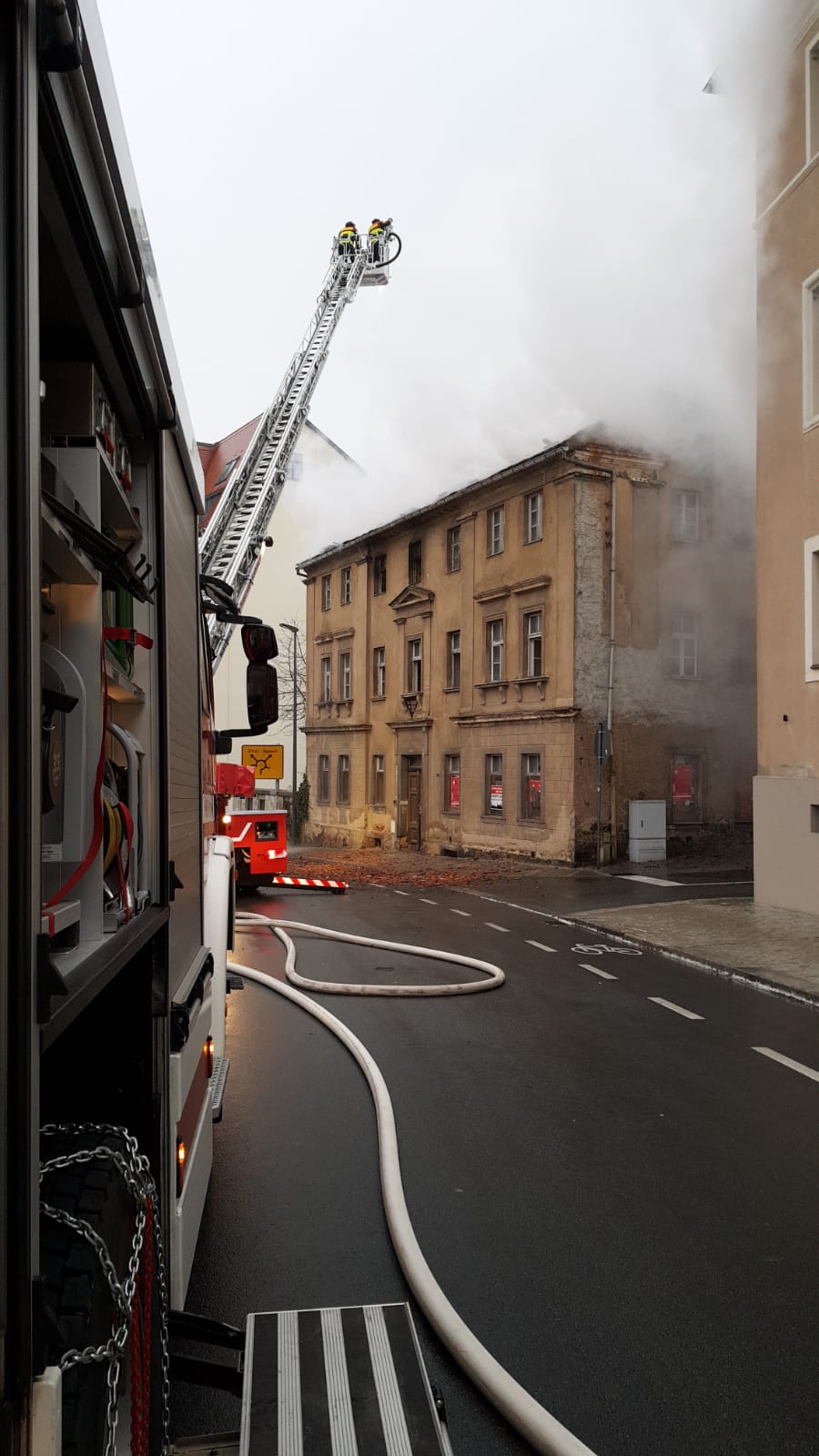 Das Glatteis vergangene Nacht hat auch die Löbauer Feuerwehr fast aus der Bahn geworfen. Nachdem es schon gestern Abend in einem leerstehenden Wohnhaus am Promenadenring gebrannt hatte, wurden die Kameraden heute Morgen erneut dorthin beordert. Der Dachstuhl stand in Flammen. Die Anfahrt gestaltete sich auf den überfrorenen Straßen schwierig. Einige Feuerwehrleute kamen zu Fuß zum Einsatzort. Das Gebäude brannte in voller Ausdehnung. Die Polizei vermutet Brandstiftung. Ermittlungen wurden aufgenommen.